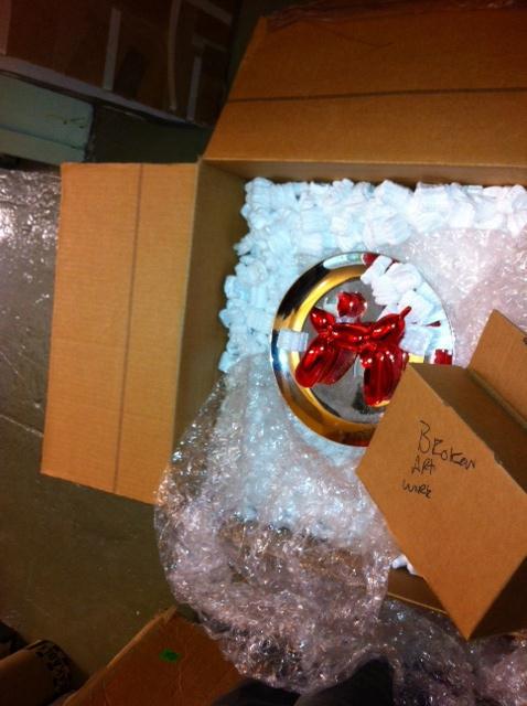 Fotografía de Jane Bennett, que muestra los pedazos de un perro de globo de Jeff Koons, al lado de una caja que dice “obra de arte rota”.